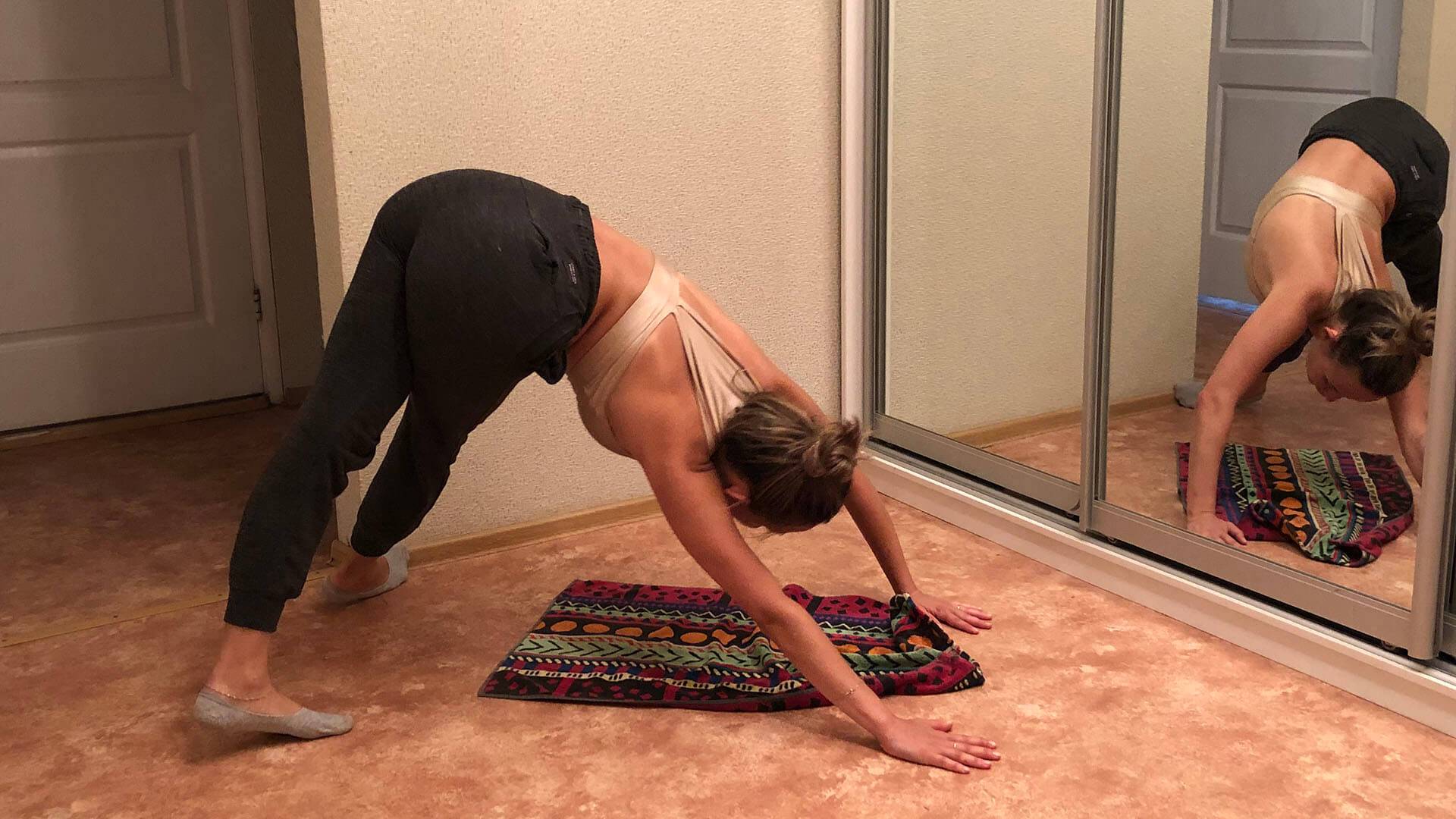 - Встаньте в положение на четвереньки. Выдвиньте правое колено, оно должно коснуться правого запястья. Бедра держите ровно. Двигайте правую голень к левой стороне таза, левую ногу вытягивайте назад. Не наклоняясь вперед, опускайте таз максимально низко, прижимая к полу руки и вытягивая талию.