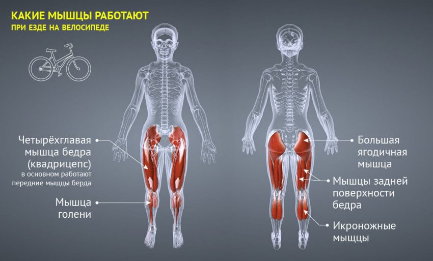 Во время тренировки в работу включаются икроножные мышцы, мышцы голени, бедра, ягодиц, спины (особенно поясничные). При повышении уровня нагрузки практически до максимальной можно почувствовать, как напрягаются мышцы пресса и рук. Благодаря воздействию на все основные группы мышц велотренажер является воистину универсальным приспособлением для домашних занятий.