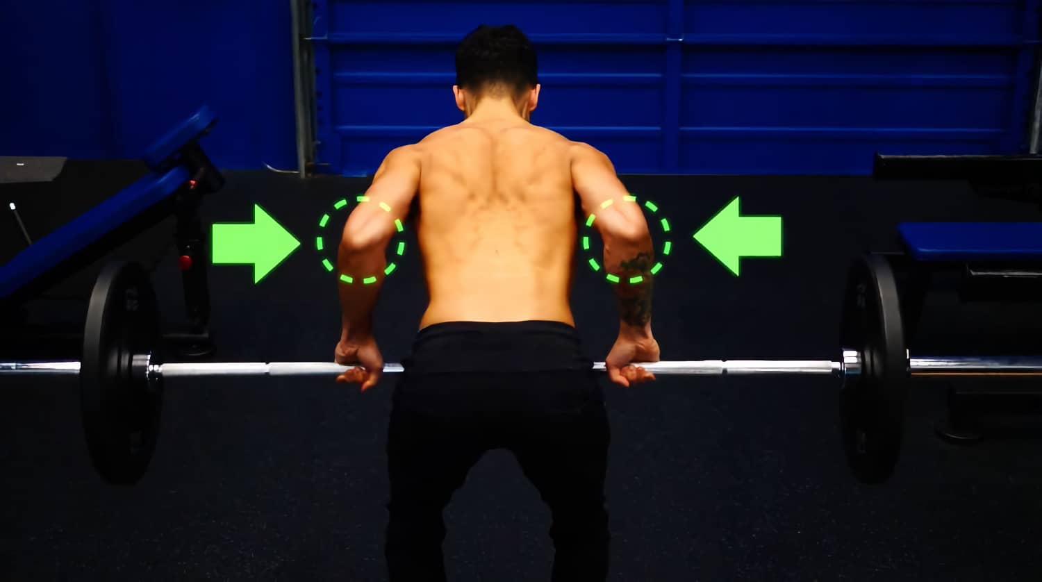 Поднимая штангу с пола, не забывайте о работе широчайших. Держите локти по направлению к стене позади вас. Старайтесь не выворачивать их в стороны.