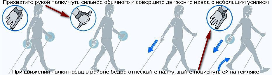 Как только рука окажется в крайнем положении сзади, кисть необходимо расслабить. Не волнуйся, что палка выпадет из рук: именно для того, чтобы этого не произошло, она и оснащена специальной перчаткой.