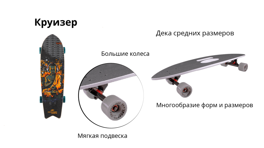 Круизеры — это скейты для детей. Эту доску используют исключительно на ровных дорогах или специальных площадках из-за колёс средней жёсткости. У лонгборда длинная доска имеет заострённый нос и приподнятую заднюю часть. Мягкие крупные колёса позволяют кататься на ровном асфальте. Складной скейтборд, у которого вместо деки имеется металлическая корзина для ног, называется стоубордом. Для выполнения трюков лучше приобрести стритборд, состоящий из нескольких платформ.