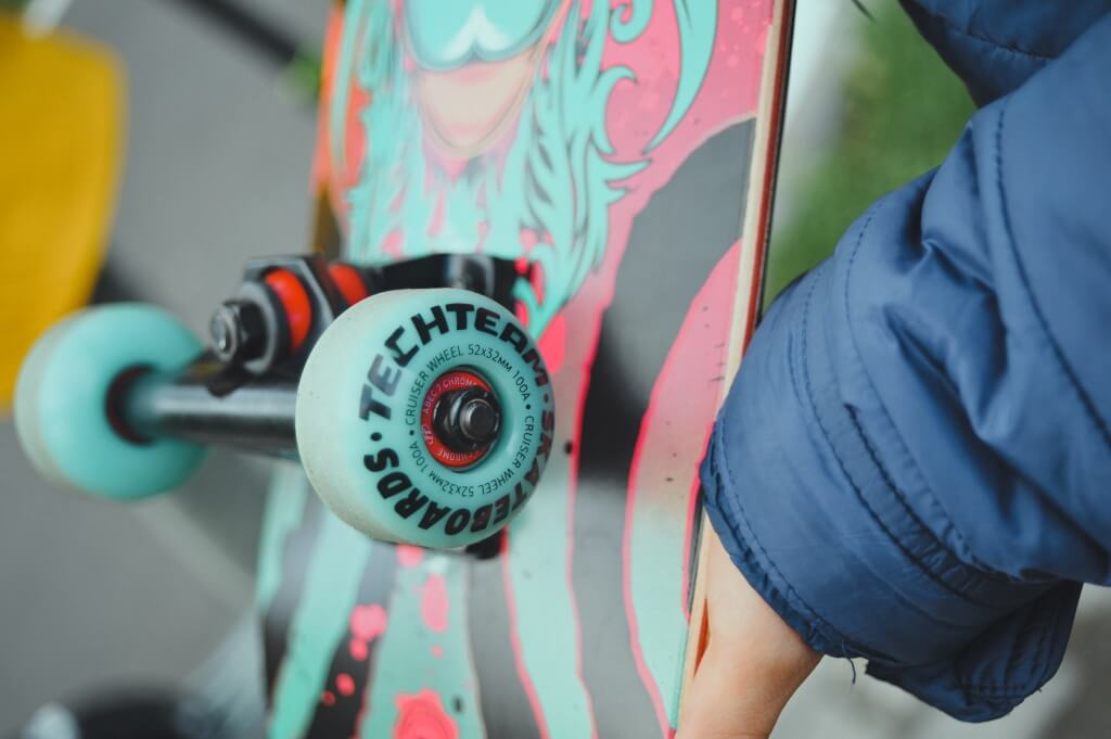 - Колеса. Основным критерием выбора колес является жесткость. Именно достаточная жесткость делает движения скейта более плавными. Если для катания на скейте имеется специальная площадка, то колеса могут быть мягкими. Для обычного двора или улицы лучше всего выбирать доску с жесткими колесами.