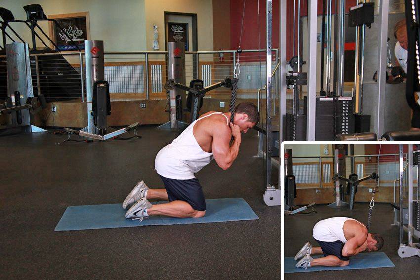 | На вертикальном блоке | Необходимо взять рукоять тренажера, встать перед ним на колени и приступить к сгибанию и разгибанию корпуса. В момент максимального сокращения мышц живота, руки должны находиться у затылка, при разгибании тела — надо лбом |