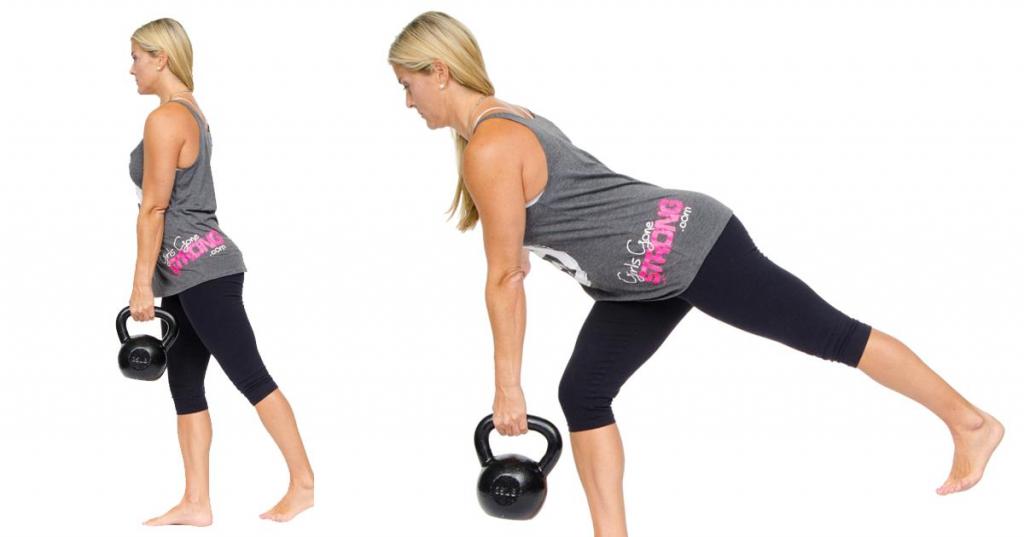 Румынская тяга также достаточно эффективна для прокачки ягодиц в позиции на одной ноге с гирей. Техника становой тяги в таком варианте отличается тем, что наклоны вперед осуществляются из позиции стоя на одной ноге, в то время как гиря взята в противоположную руку: тренирующийся опускает правой рукой гирю вниз при наклоне вперед, при этом левая нога отрывается от пола и отводится назад, создавая с полом параллельную линию. Такая методика прокачивания большой ягодичной мышцы является весьма эффективной.