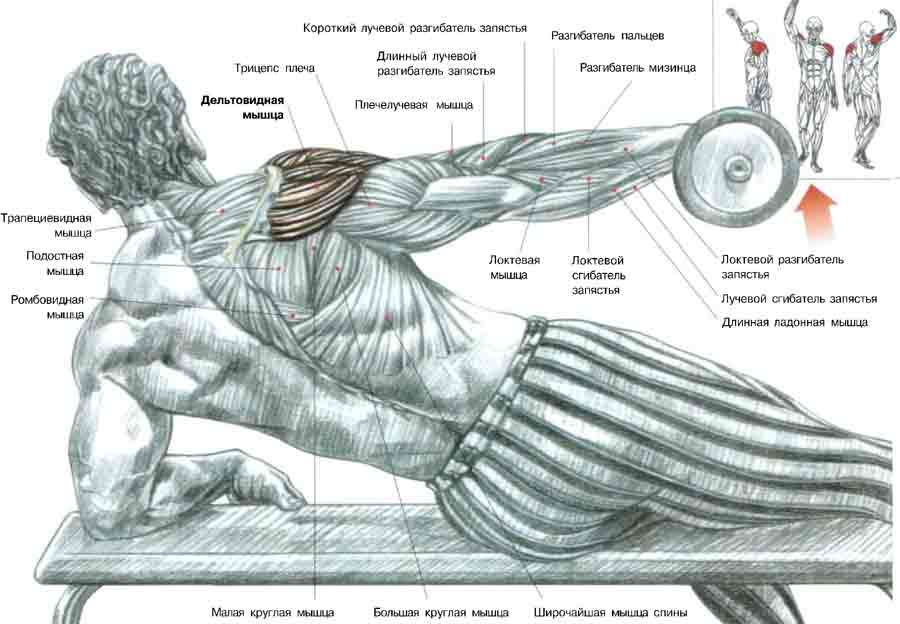 Это хорошее изолированное упражнение, которое прорабатывает среднюю и заднюю дельтовидные мышцы. Это упражнение хорошо еще и тем, что позволяет нагружать мышцу не постепенно, доводя нагрузку до своего максимум в конце выполнения, как в подъемах из положения стоя или сидя, а, наоборот, максимальная нагрузка приходится на начало движения. Легендарный французский бодибилдер Серж Нюбре считает, что это упражнение может творить настоящие чудеса, главное строго соблюдать технику и не брать слишком большие веса.
