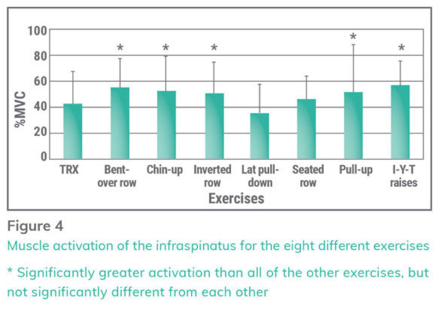 4. Подостные мышцы. Максимально активировали IYT-подъемы, подтягивание на низкой перекладине, тяга в наклоне, подтягивания прямым и обратным хватом.