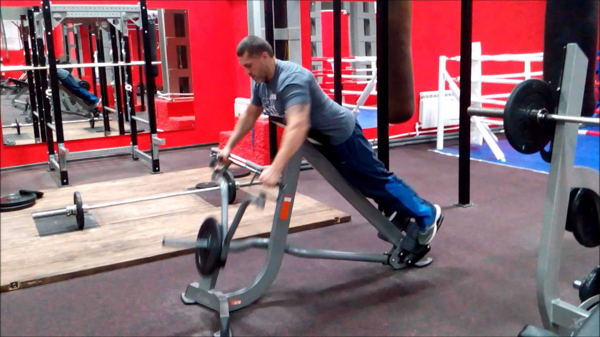 Еще одно название такого упражнения – тяга штанги стоя в наклоне, потому что оно не может выполняться сидя. Хотя, есть специальные тренажеры, в которых можно лечь вниз лицом и делать то же самое движение. Нагрузка на мышцы поясницы исчезает совсем. Тяга такого грифа – хорошая альтернатива для людей с больной спиной, но такой тренажер присутствует далеко не в каждом тренажерном зале.