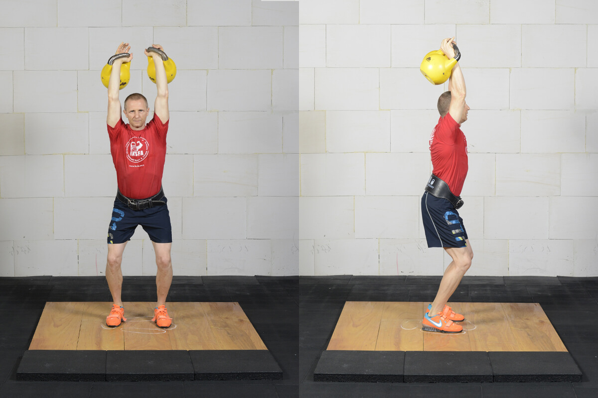 - Выполните толчок – немного присядьте и тут же выпрямитесь, при этом резко выбрасывая гирю вверх.