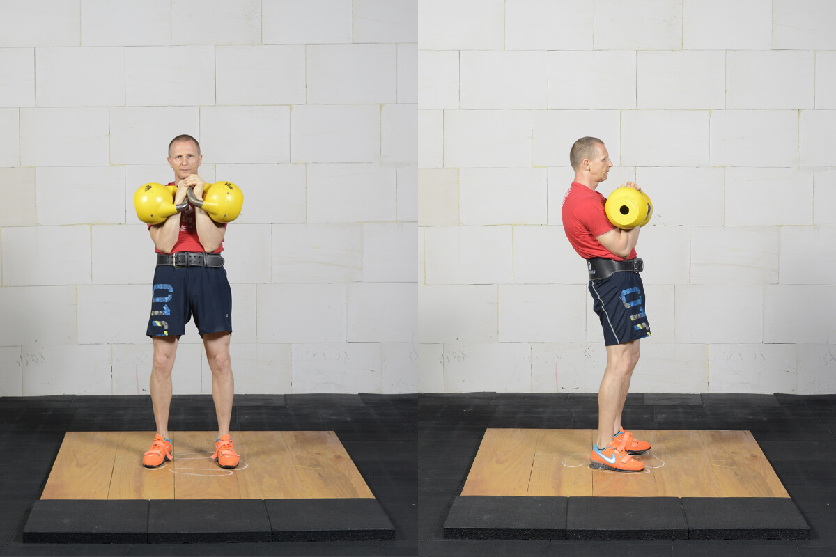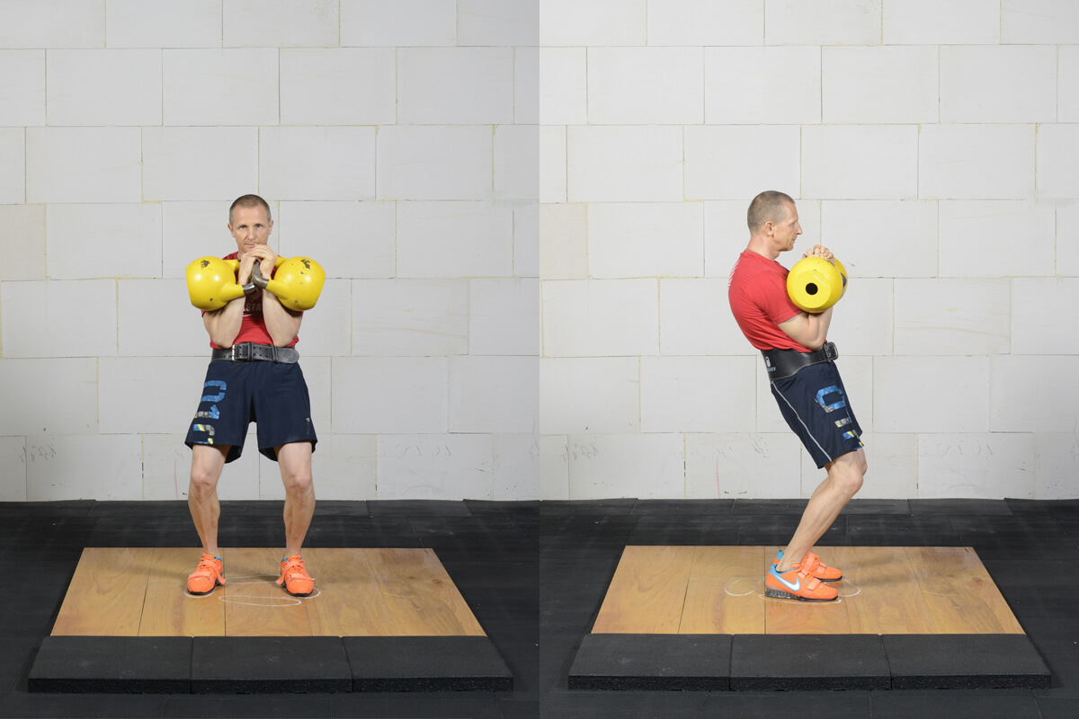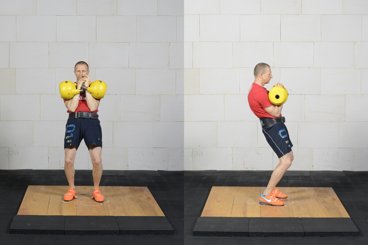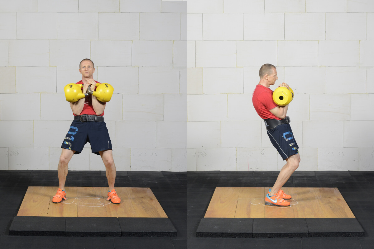 Снаряд в исходной позиции нужно держать двумя руками по бокам ручки на уровне груди. Ноги – на ширине плеч, носки чуть разведены в стороны. Затем происходит обычное при приседаниях сгибание ног до параллели бедер с полом (или чуть ниже) и дальнейший подъем, при этом одновременно распрямляются руки вместе с гирей. Не забывайте, что спину нужно держать ровной, не горбиться и не наклоняться.