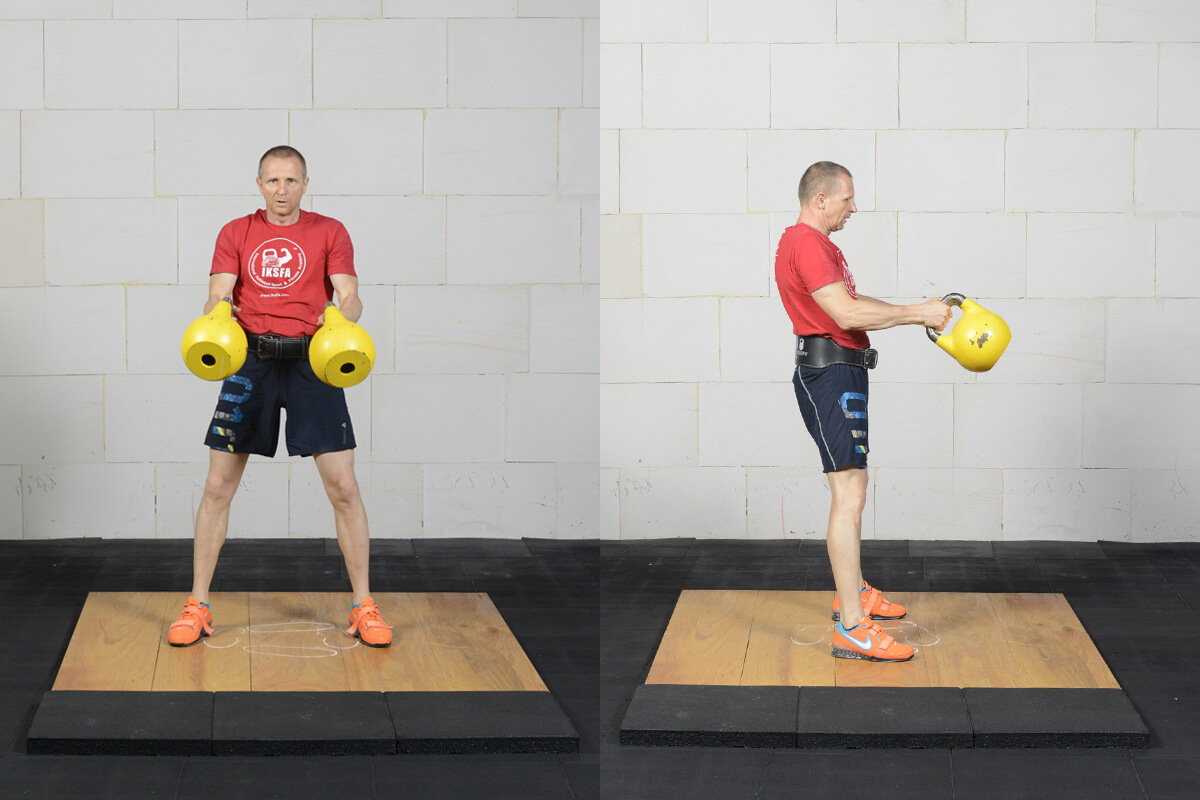 «Старт» спортсмен забрасывает гири на грудь и начинает подъем их вверх. Соревновательная цель — выполнить наибольшее количество подъемов в течение 10 минут. Хотелось бы описать некоторые нюансы данного упражнения, а именно расположение рук, положение ног, положение гири в ладони.