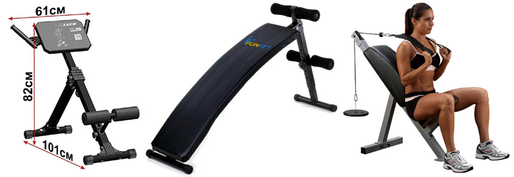 Скамейки для гиперэкстензии, в силу анатомически-физиологических различий, бывают мужские и женские, см. рис. Крепкая амазонка может делать гиперэкстензивные упражнения и на мужской скамейке, но дамам, цель которых – избавление от галифе, стройная осанка и плоский живот, нужна только женская скамья для гиперэкстензии, слева на след. рис. Начинать приводить себя в порядок, не рискуя репродуктивным здоровьем, лучше все-таки на наклонной скамье с изогнутой доской, в центре, а «продвинутым» красавицам заниматься прессом с грузом, сидя тоже на специальной скамье, справа.