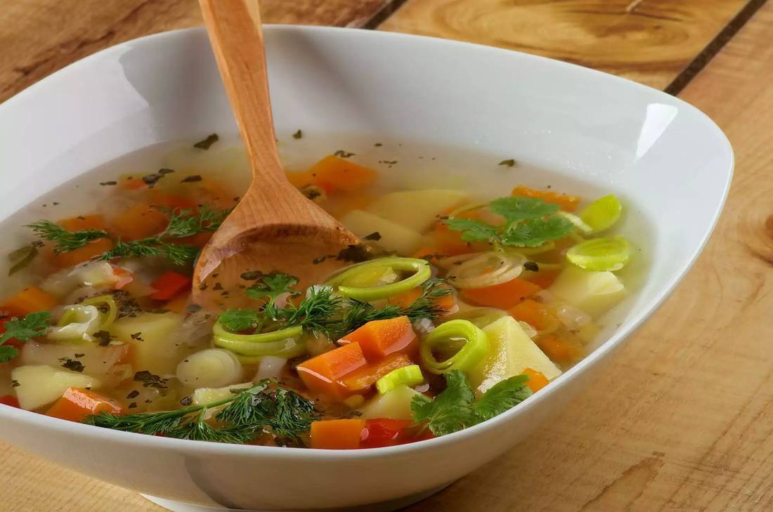 - Суп с рыбой, ломтик цельнозернового хлеба, овощи.
