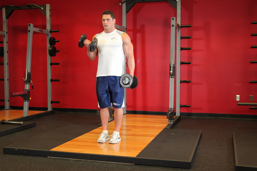 «Австрийский дуб» (как сам себя любил называть Шварценеггер) «оттачивал» бицепсы поочередным подъемом гантелей на бицепс в положении стоя, это упражнение он иногда выполнял при помощи устройства, называемого «arm blaster». Данное устройство помогало ему фиксировать локти по бокам, что способствовало ещё большей изоляции бицепса.