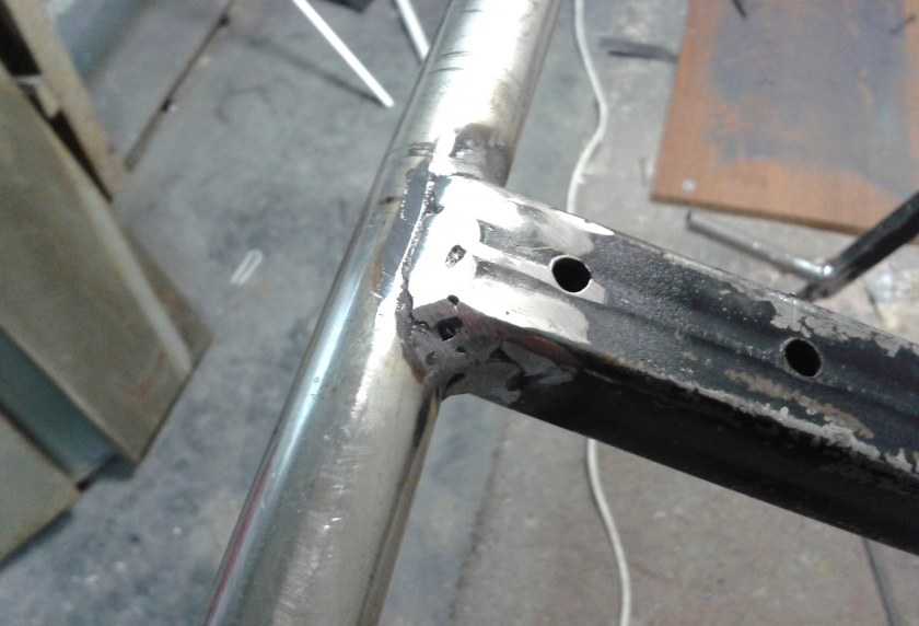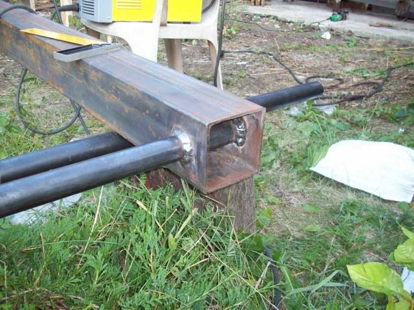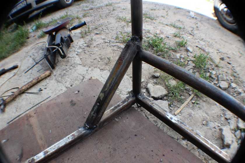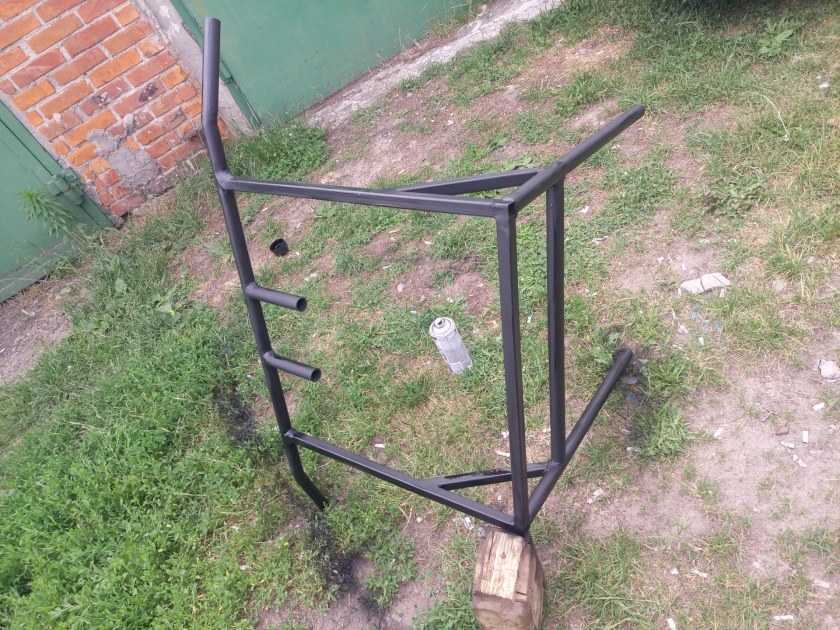 Несмотря на недостатки, вышеприведенная конструкция много раз повторена. Она проста, надежна, занимает немного места, поэтому популярна. Размеры немного корректируют, оставляя диаметры труб и толщину уголков без изменений или увеличивая толщину стенок. Пример — на фото ниже.