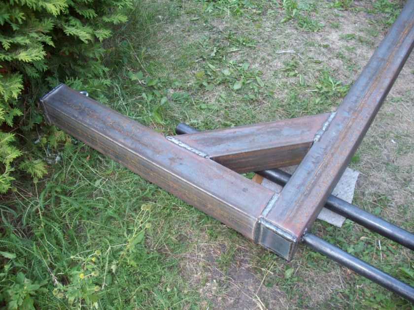 Две пары металлических отрезков пойдут на изготовление двух уголков, а к каждому следует прикрепить перекладину. Оба уголка затем привариваете к раме. Чтобы перекладину прикрепить к уголку, сначала проделываются отверстия на нижней планке, перекладина вставляется и свариваются места соприкосновения.