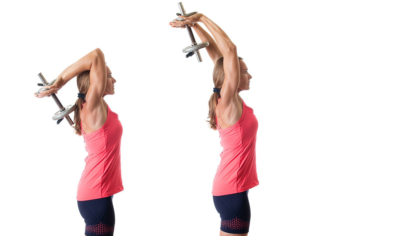 - Медленно сгибаем и разгибаем руки с гантелью за головой.