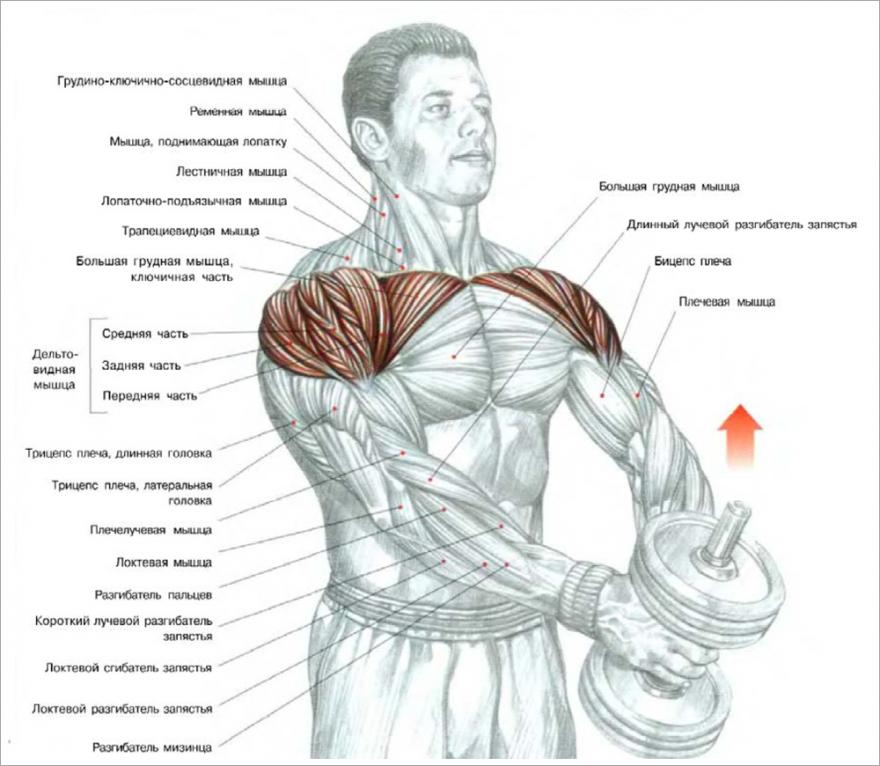 Упражнение выполняется в положении сидя или стоя, для этого необходима одна гантель. Учитывайте, что нагрузка распределяется на обе руки, поэтому подбирайте соответствующий вес.