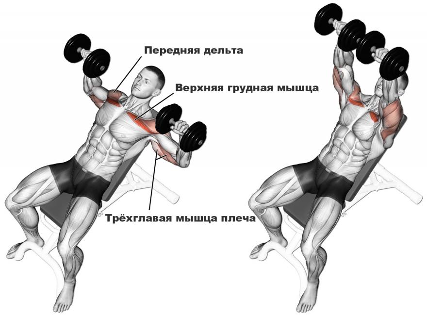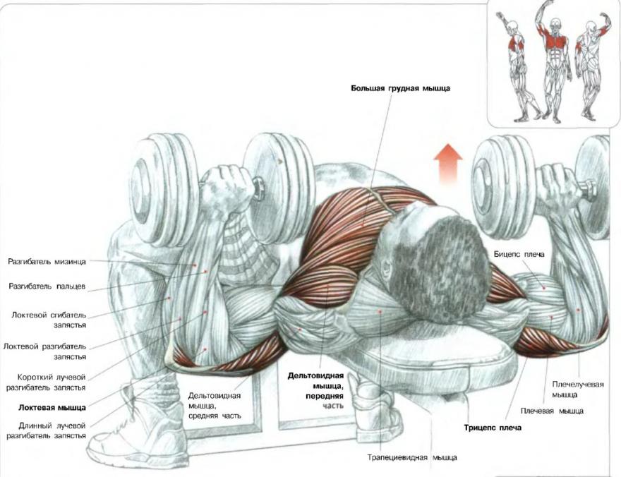 Это мегасет для набора массы и развития выносливости: вы чередуете три жимовых движения, растягивая подход. Конечно, надо уметь правильно выполнять все эти упражнения, отработайте их сначала с малыми весами.