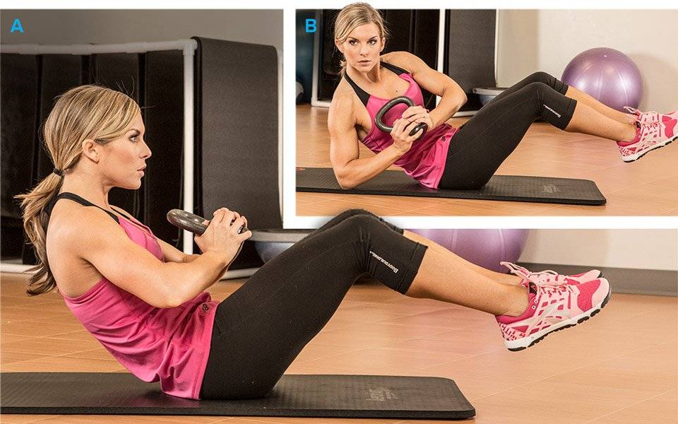 Разрешается удерживать ноги на весу, как это прописано для классического исполнения, отягощение в таком случае удерживайте на вытянутых впереди руках. Если поставлена цель, закачать нижние мышцы пресса, то вместо скручиваний корпуса можно прибегнуть к поворотам таза.